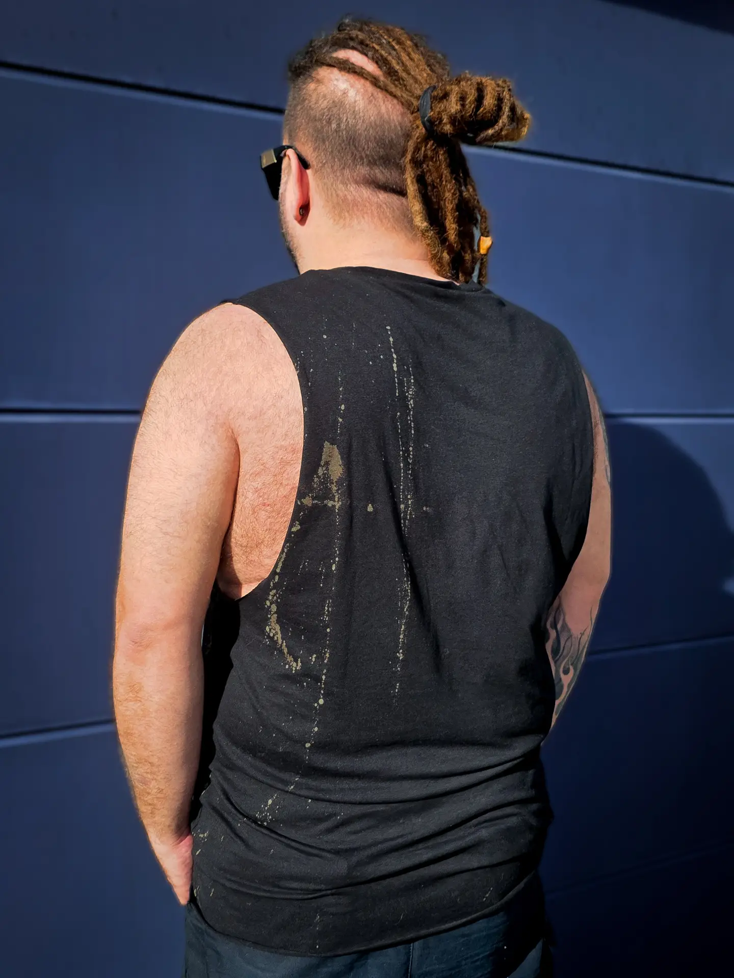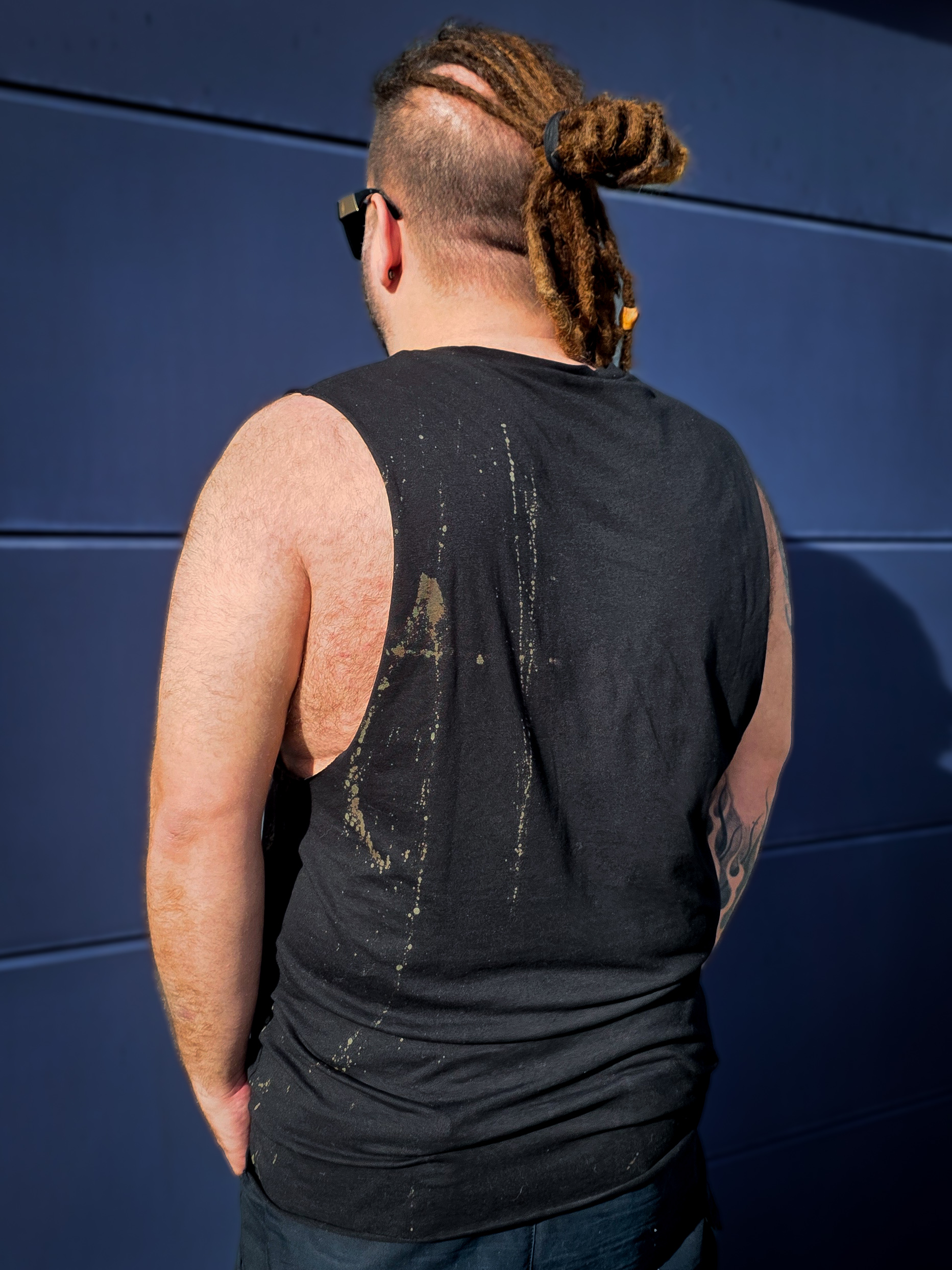 Dieses Muscleshirt ist pure Atelier Energie. Jedes Stück wird von Hand gebleicht und mit individuellen oliven Farbspritzern gestaltet. Manche Shirts wirken dezent, andere wilder und freier. Genau dadurch erzählt jedes Piece seine eigene Story und wird zu einem echten Unikat.
