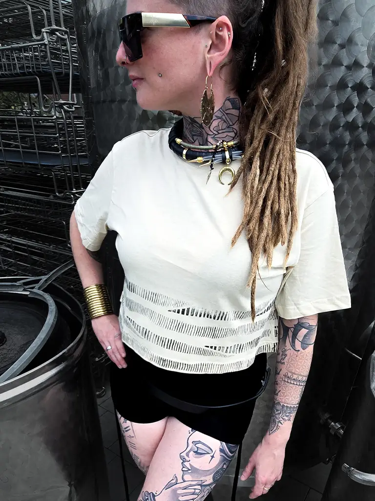 Ein Hauch Vergangenheit, neu interpretiert: Das „LIGHT OF SUCCESS“ Cropped Shirt vereint historischen Walzendruck aus alten Zeiten mit modernem Streetstyle und feiner Ästhetik.