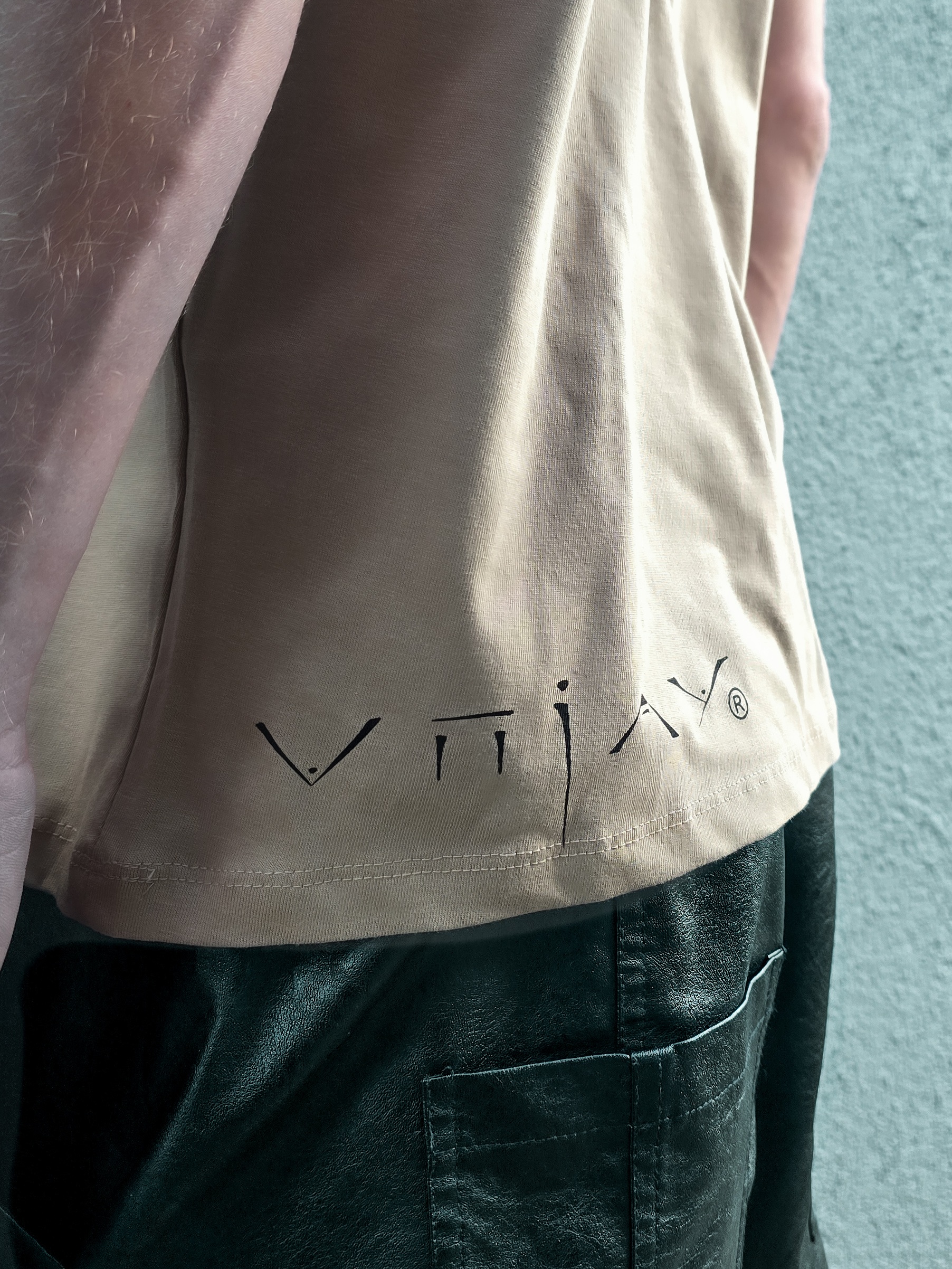 Sandfarben, mit schwarzem Bullseye-Symbol im Siebdruck, steht es für Zielbewusstsein, Klarheit & urbanen Spirit.